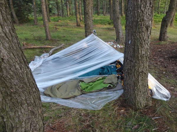 Tentokrát v igelitovém přístřešku což bylo rozumné rozhodnutí , i když bylo teplo tak nad ránem začal foukat takový vítr jaký jsem tam snad ještě nezažil .